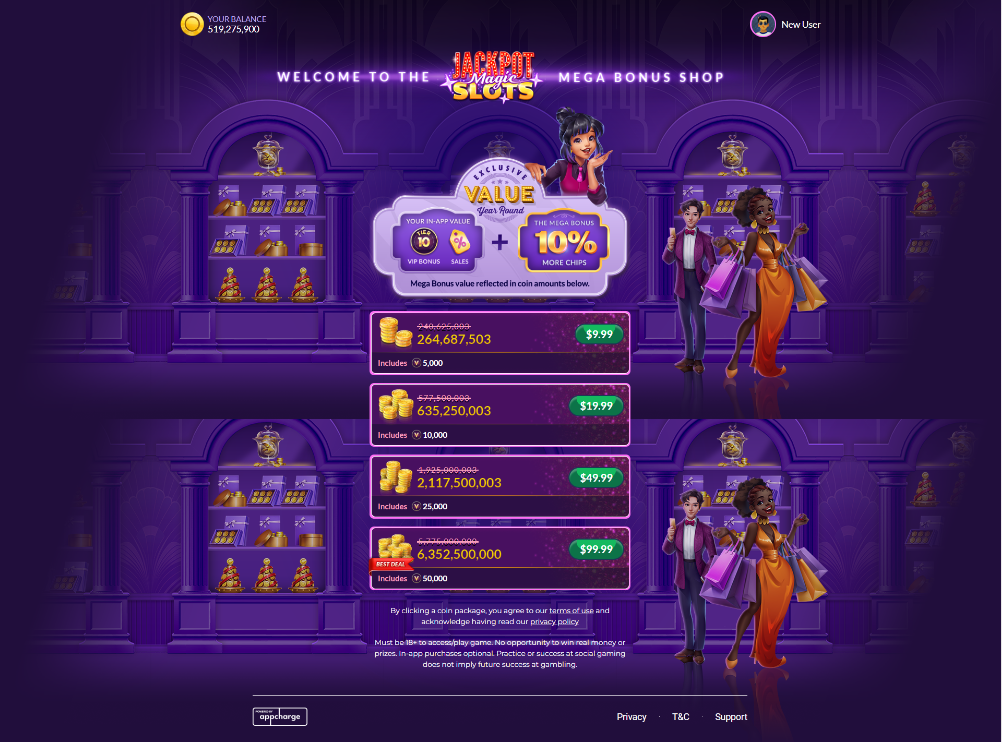 Jackpot Magic Slots Mega Bonus Shop is a new addition introduced for our customers to gain even more value when purchasing virtual in-game currency. You can find at least 10% more coins per purchase through this new shop, make sure to check it out at shop.jackpotmagicslots.com.